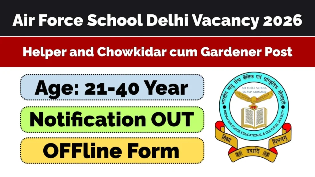 | Air Force School Delhi Vacancy 2026: Air Force Nursery School, Delhi, has issued a notification for the position of Helper and Chowkidar cum Gardener. The recruitment drive comprises 03 vacancies. All eligible and interested candidates are advised to carefully read the official notification and apply before 11-05-2026, the last Date. All relevant information regarding the Air Force School Delhi Vacancy 2026 recruitment is provided below. |