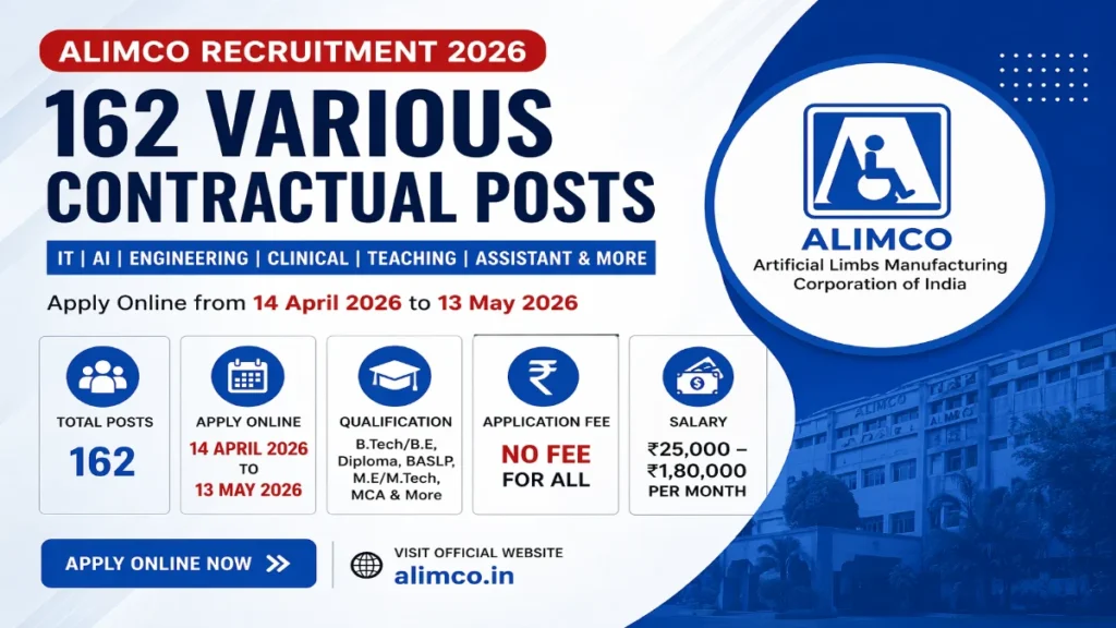 Short Information: The Artificial Limbs Manufacturing Corporation of India (ALIMCO) has released the official notification for the recruitment of Junior Manager, Officer, IT, AI, Clinical and Various Posts on a contractual basis. Eligible candidates can apply online from 14 April 2026 to 13 May 2026 through the official website alimco.in.