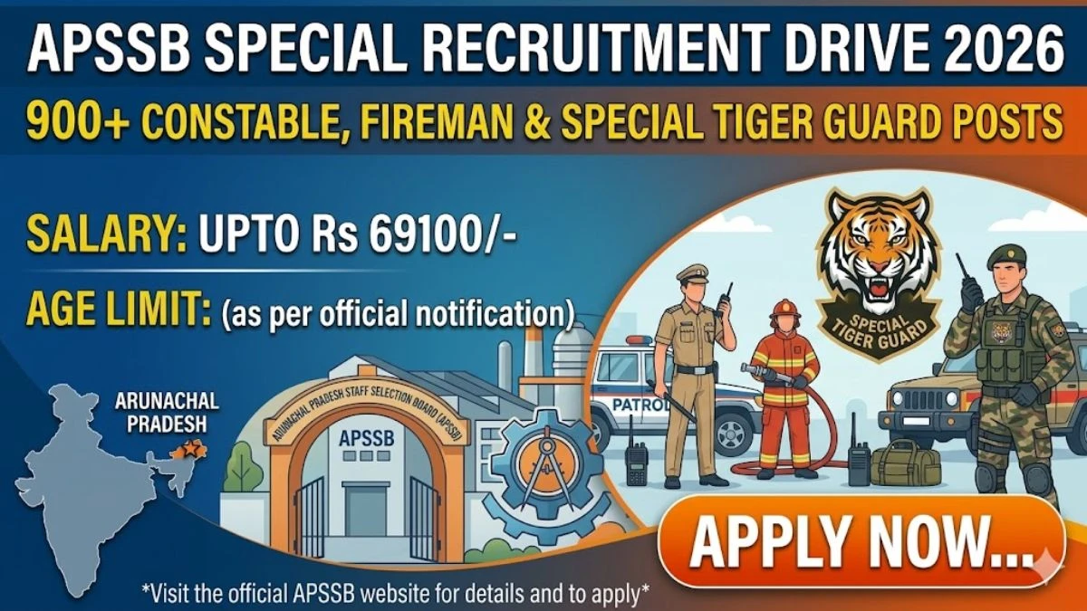 Arunachal Pradesh Staff Selection Board (APSSB) has released the Special Recruitment Drive for Uniformed Services Combined Examination 2026 for Group C posts in various departments. Through this drive, a total of 984 vacancies are notified for Constable Band (IRBn), Constable Bugler (IRBn), Constable IRBn, Constable Civil Police (Male & Female), Fireman and Special Tiger Guard under STPF. Eligible 10th pass candidates can submit their online application on the official APSSB website within the given dates, and selection will be done through written exam, PST/PET, trade test and medical fitness test.