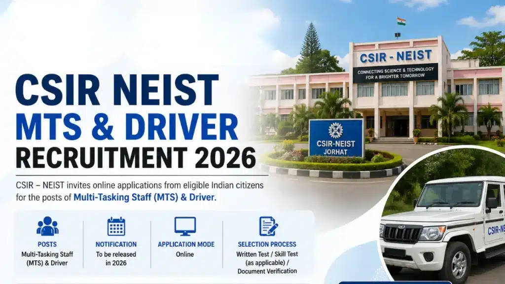 CSIR-NEIST MTS, Driver Recruitment 2026 : Get complete details about CSIR-NEIST MTS, Driver Recruitment 2026, including recruitment updates, total vacancies, important dates, application fees, eligibility criteria, age limit, selection process, salary, syllabus, exam pattern, admit card, answer key, result, and more.