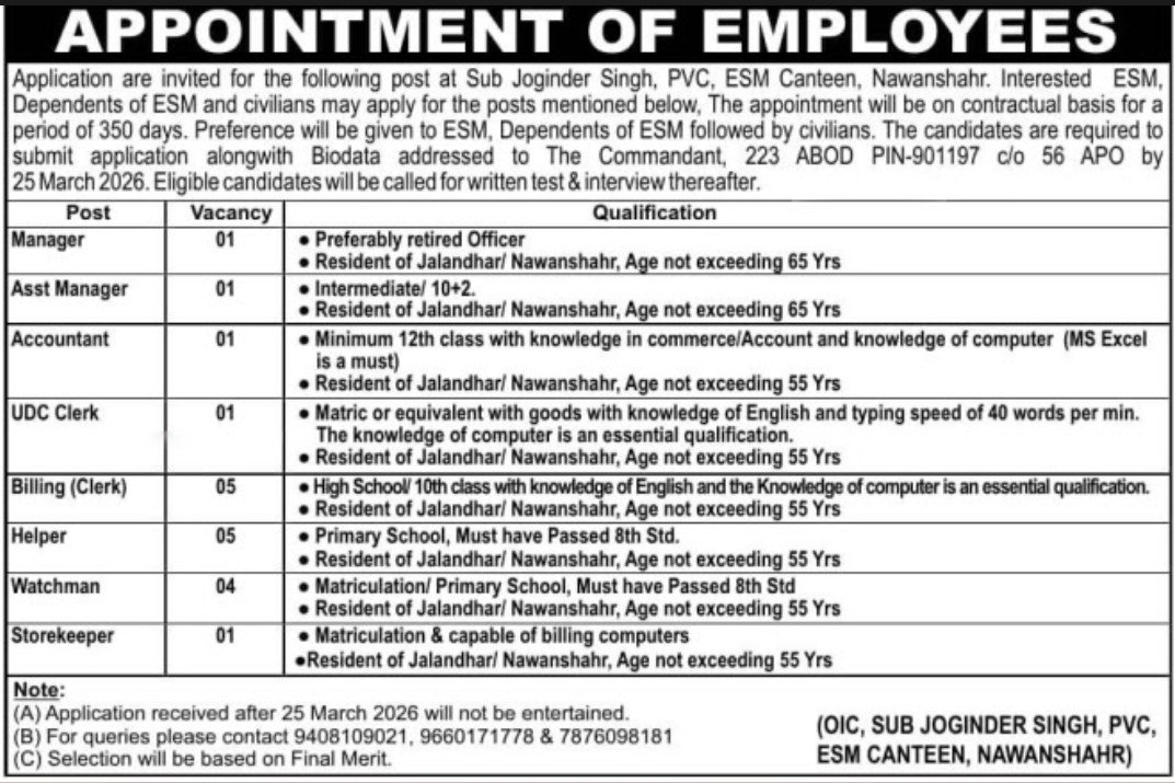 Army Canteen Nawanshahr Vacancy 2026: The Sub Joginder Singh PVC ESM Canteen, Nawanshahr (Punjab) has released a notification for the Manager, Clerk, Helper & Other Posts. All interested and eligible candidates must read the Army Canteen Nawanshahr Vacancy 2026 notification carefully and submit their applications before the prescribed deadline. See all information related to the Army Canteen Nawanshahr Vacancy 2026 post on the official website. All the details related to the Army Canteen Nawanshahr Vacancy 2026 are provided below.
