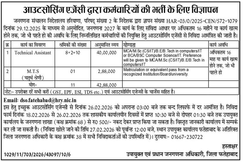 - Email: dso.fatehabad@hry.nic.in इस हेतु इच्छुक आउटसोर्सिंग एजेन्सी से दिनांक 26.02.2026 को अपरान्ह 03:00 बजे तक बन्द लिफाफे में दर आमंत्रित है। निविदा फार्म दिनांक 18.02.2026 से 26.02.2026 तक शासकीय कार्यालयीन दिवसों में प्राप्त 10:30 बजे से दोपहर 01:30 बजे तक उपायुक्त कार्यालय के जनगणना शाखा (कक्ष क्रमांक 68) से रु0 500/- नकद देकर प्राप्त किया जा सकता है। विस्तृत जानकारी कार्यालय में सम्पर्क कर ली जा सकती है। (निविदा खोले जाने की तिथि 27.02.2026 को पूर्वान्ह 12:00 बजे, स्थान उपायुक्त कार्यालय फतेहाबाद के अतिरिक्त जिला जनगणना अधिकारी के कक्ष क्रमांक 38 में सभी निविदाकर्ताओं की उपस्थिति में)। दुरमाषः 01667-230722.
