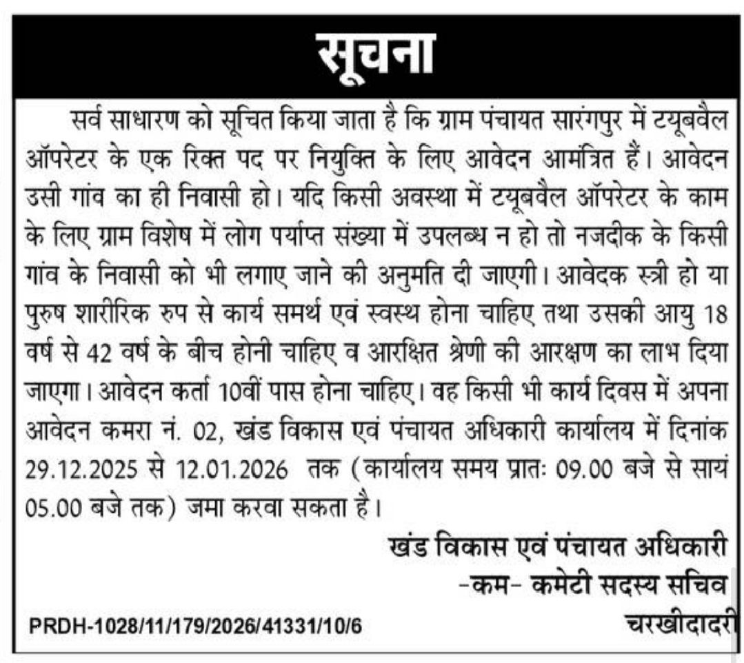 Haryana Tubewell Operator Vacancy 2026 : Gram Panchayat Sarangpur District Charkhi Dadri, Haryana issue the Haryana Tubewell Operator Vacancy Offline Application form for Tubewell Operator posts. Interested Candidate can apply through Submitting their application form via By Hand. All details related to Haryana Tubewell Operator Recruitment 2026 are given below in this post.