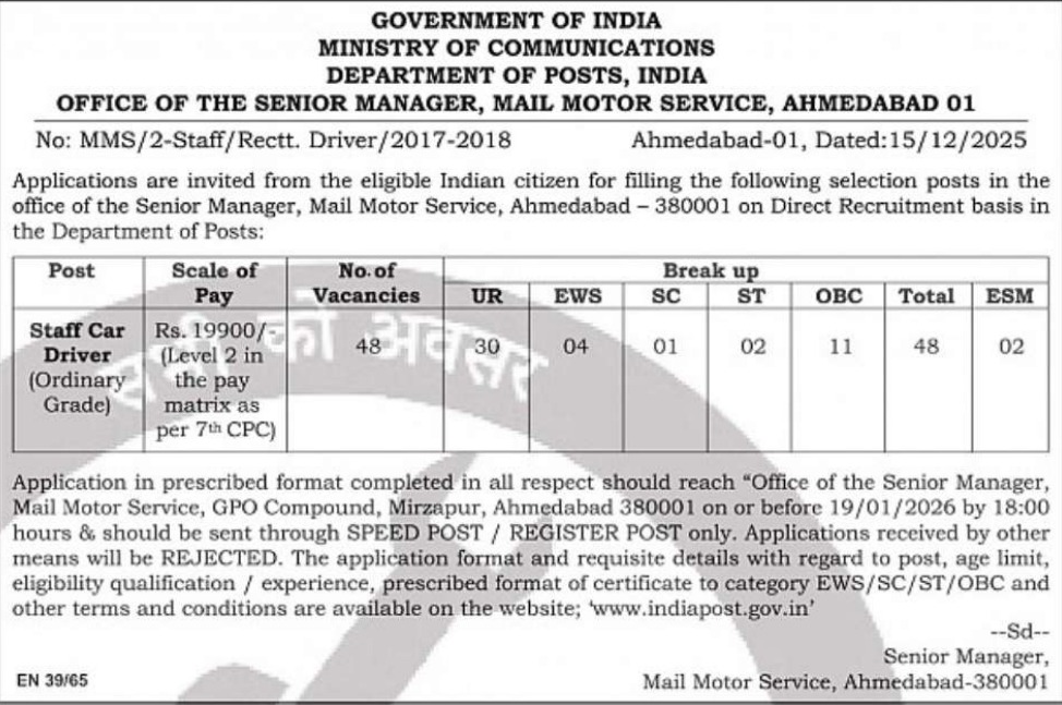 - Now send this application form to “Office of the Senior Manager, Mail Motor Service, GPO Compound, Mirzapur, Ahmedabad – 380001”