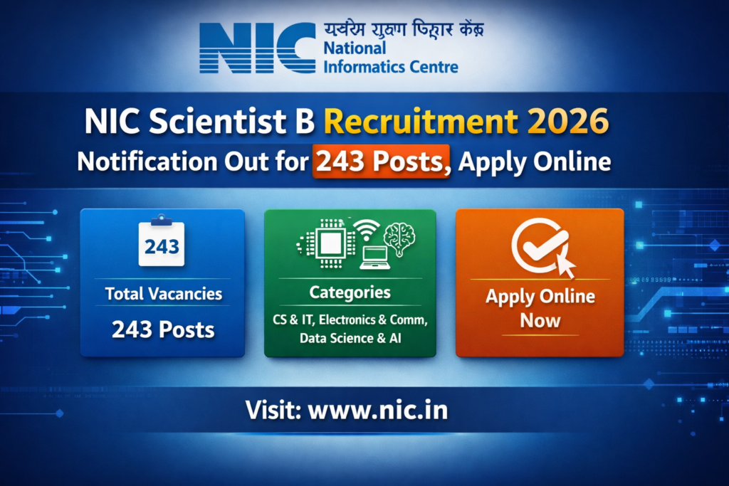 NIC Scientist-B Recruitment 2026 : Get complete details about NIC Scientist-B Recruitment 2026, including recruitment updates, total vacancies, important dates, application fees, eligibility criteria, age limit, selection process, salary, syllabus, interview date, result, and more.