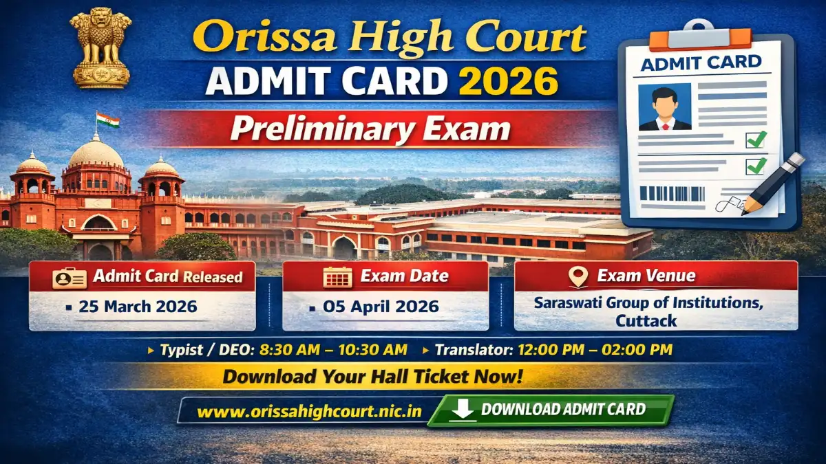 Short Information: The High Court of Orissa has released the Preliminary Examination Admit Card 2026 on 25 March 2026 for the posts of Junior Grade Typist/Data Entry Operator (Advt. No. 01/2026) and Translator (Advt. No. 02/2026). The exam will be conducted on 05 April 2026 at Cuttack. Candidates can download their hall ticket from the official website.