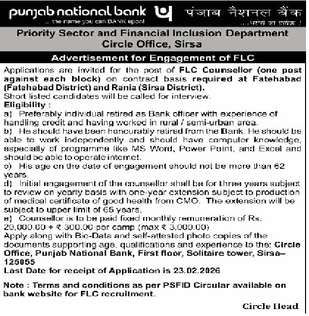 PNB Sirsa FLC Counselor Recruitment 2026: The Punjab National Bank Sirsa has Applications are invited for the post of FLC Counsellor (one post against each block) on contract basis required at Fatehabad (Fatehabad District) and Rania (Sirsa District). Short listed candidates will be called for interview.