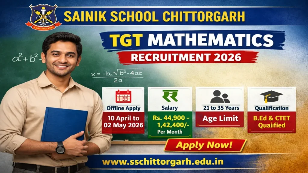 Short Information: The Sainik School Chittorgarh has released the official notification for the recruitment of Trained Graduate Teacher (Mathematics) post. Eligible candidates can apply offline from 10 April 2026 to 02 May 2026 through the official website sschittorgarh.edu.in.