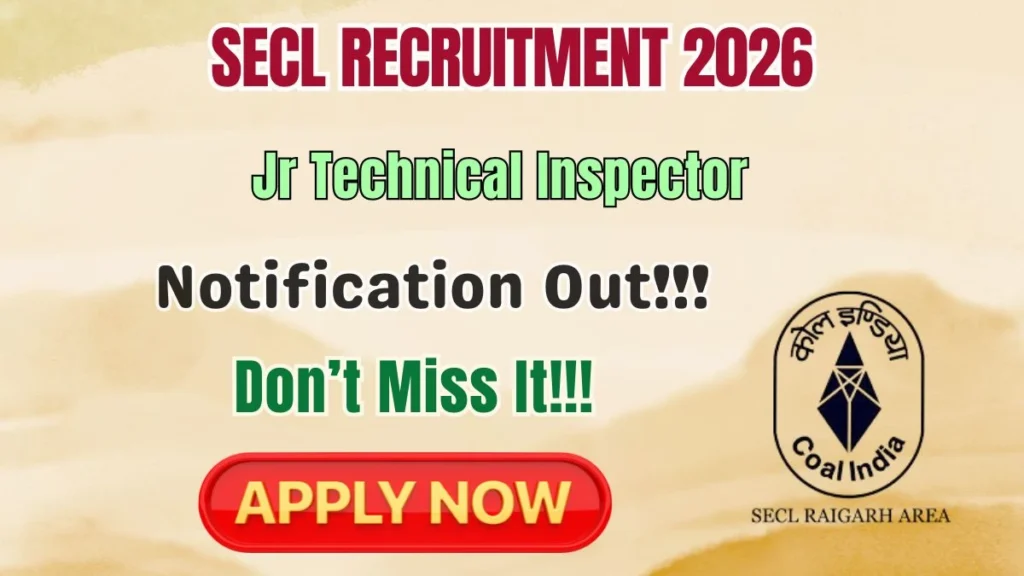 Short Information: The South Eastern Coalfields Limited (SECL) has released the official notification (Ref. No. SECL/BSP/HR/NEE/2026/अधिसूचना/183 dated 28.04.2026) for recruitment to the post of Jr. Technical Inspector, T&S Grd-D. This recruitment is strictly for internal departmental employees of SECL. Eligible candidates can apply online from 30 April 2026 to 20 May 2026 through the SECL Internal Portal.