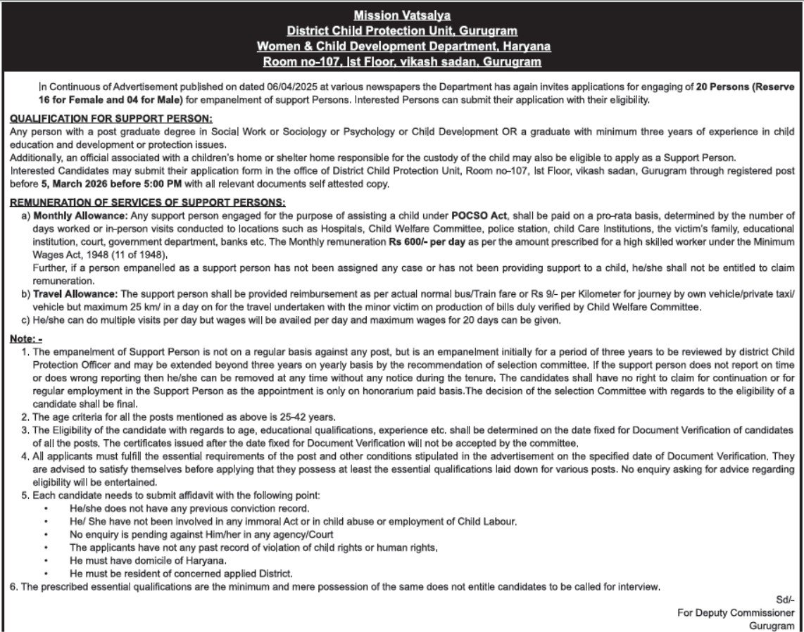 - Send Application Form: Interested Candidates may submit their application form in the office of District Child Protection Unit, Room no-107, Ist Floor, vikash sadan, Gurugram through registered post before 5, March 2026 before 5:00 PM with all relevant documents self attested copy.