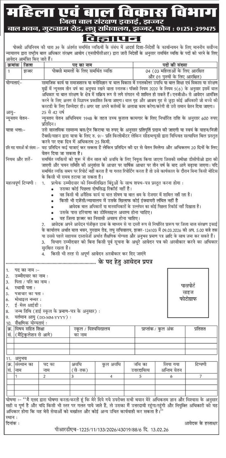 - Send Application Form: Applicants may submit their applications through registered post or by hand in the prescribed format to the office of District Child Protection Unit i.e. Bal Bhawan, Gurugram Road, Mini Secretariat, Jhajjar-124103 on or before 09.03.2026 by 5.00 PM along with supporting documents i.e. lower educational qualification and experience certificates etc. 3. The Department reserves the right to reject incomplete applications without any prior notice to the candidate.
