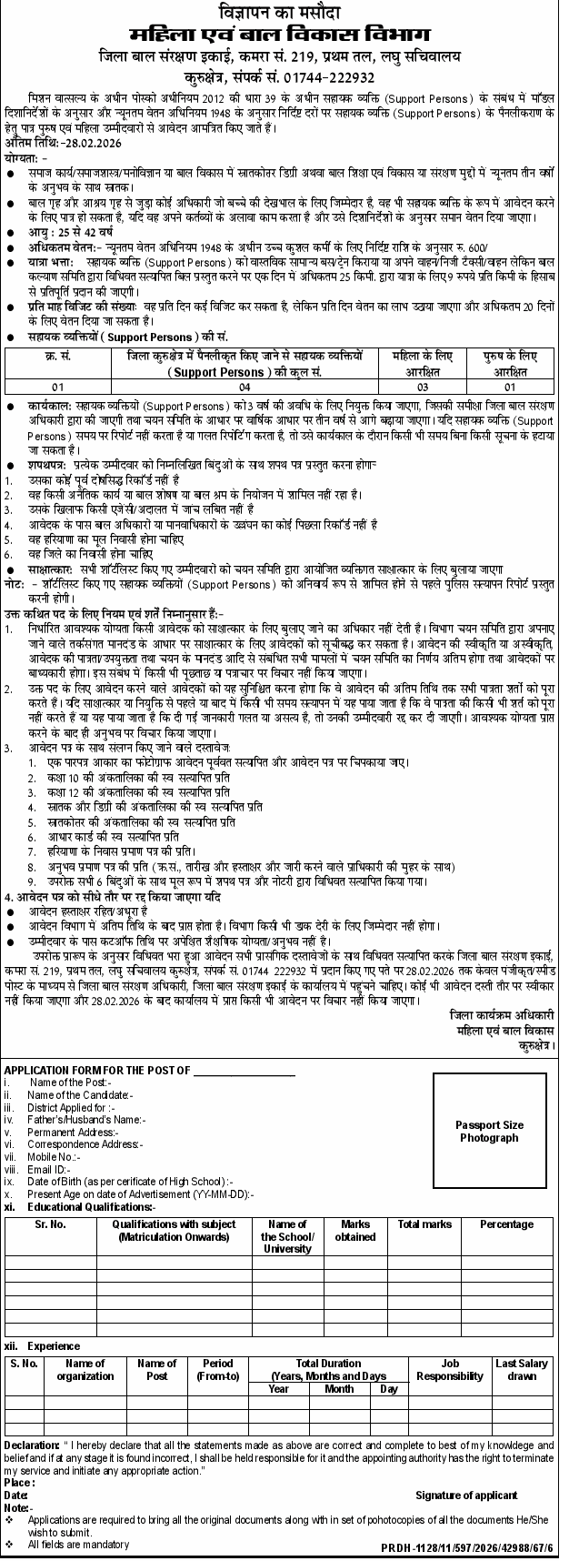 - Send Application Form: The application should reach the office of District Child Protection Officer, District Child Protection Unit through Registered Speed Post only at the address provided in District Child Protection Unit, Room No. 219, 1st Floor, Mini Secretariat Kurukshetra, Contact No. 01744 222932 latest by 28.02.2026.